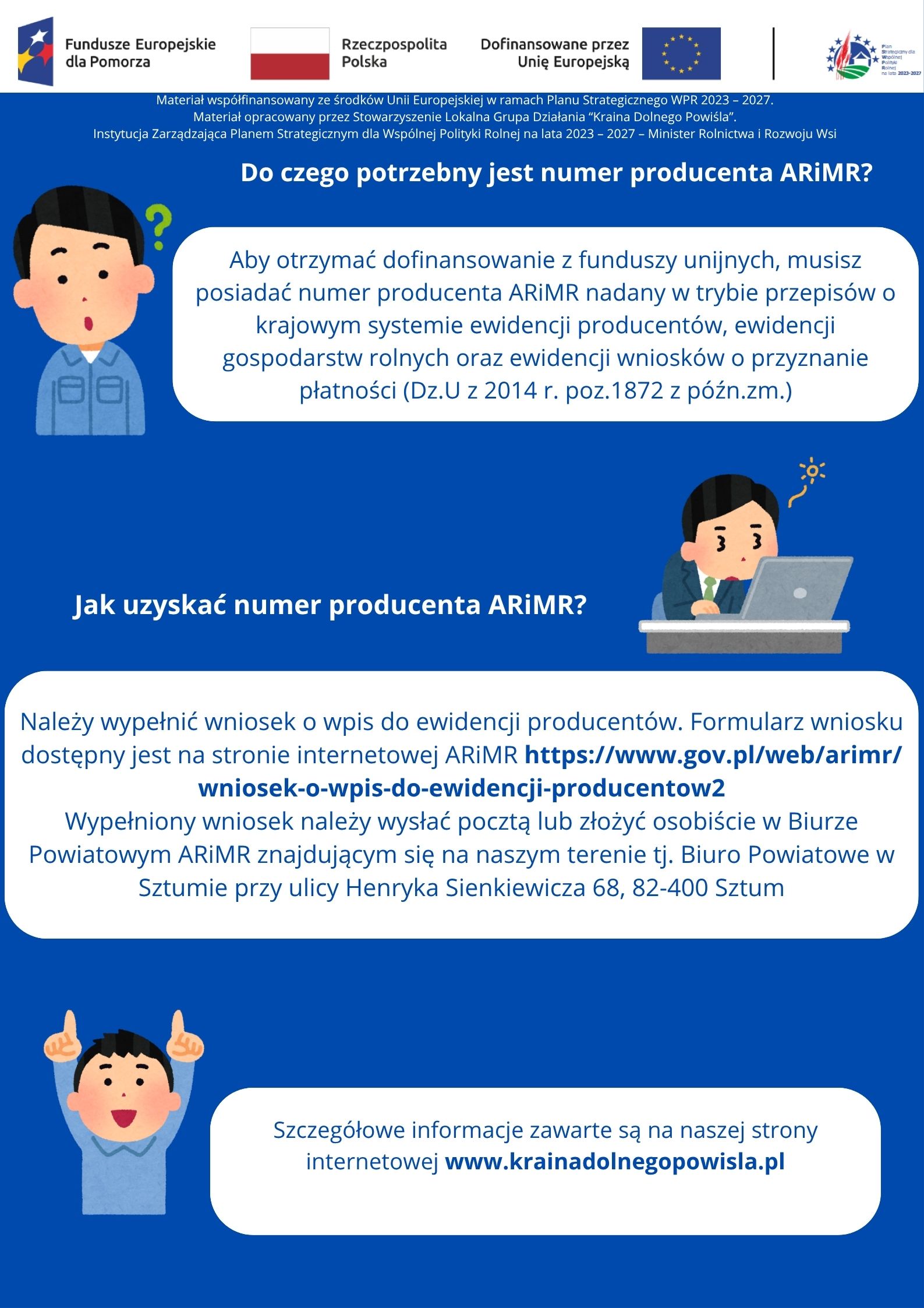 Niezależnie od tego, czy jesteś osobą fizyczną planującą założenie działalności gospodarczej, jednostką sektora finansów publicznych, stowarzyszeniem czy inną osobą prawną – aby otrzymać dofinansowanie z funduszy unijnych, musisz posiadać numer producenta ARMiR nadany w trybie przepisów o krajowym systemie ewidencji producentów, ewidencji gospodarstw rolnych oraz ewidencji wniosków o przyznanie płatności (Dz.U z 2014 r. poz. 1872 z późn. zm.).