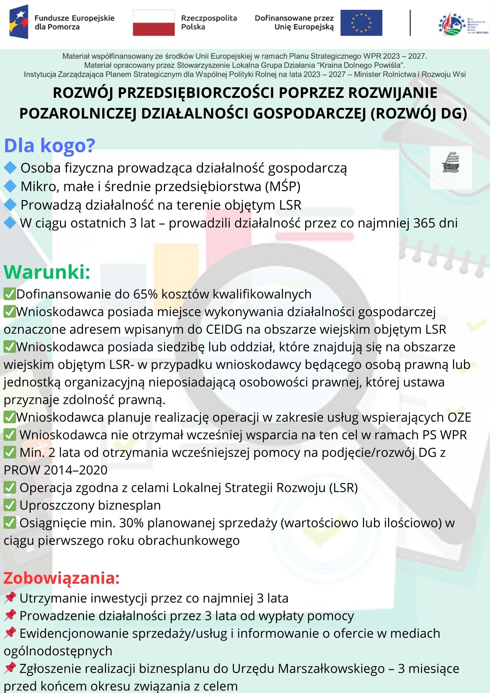 Stowarzyszenie Lokalna Grupa Działania „Kraina Dolnego Powiśla” poniżej przedstawia niezbędne informacje dla osób, które planują ubiegać się o wsparcie na rozwój pozarolniczej działalności gospodarczej (ROZWÓJ DG) w ramach Planu Strategicznego dla Wspólnej Polityki Rolnej 2023–2027.