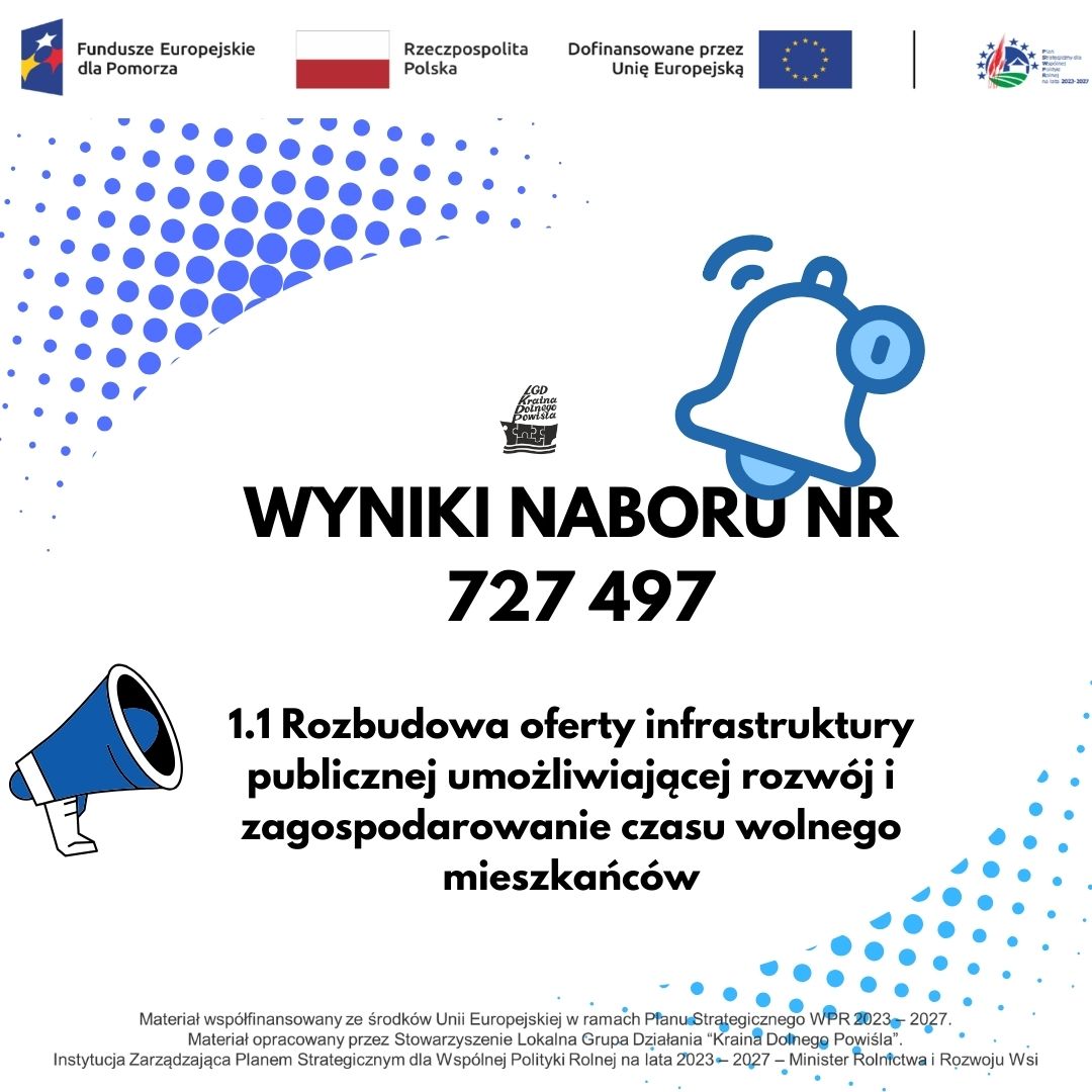 Poniżej przedstawiamy wyniki naboru nr 727 497 z zakresu Poprawa dostępu do małej infrastruktury publicznej w ramach wdrażania Lokalnej Strategii Rozwoju realizowanej przez Stowarzyszenie Lokalna Grupa Działania “Kraina Dolnego Powiśla” w ramach Planu Strategicznego dla Wspólnej Polityki Rolnej na lata 2023-2027 dla interwencji I.13.1 LEADER/Rozwój Lokalny Kierowany przez Społeczność (RLKS)- komponent Wdrażanie LSR.